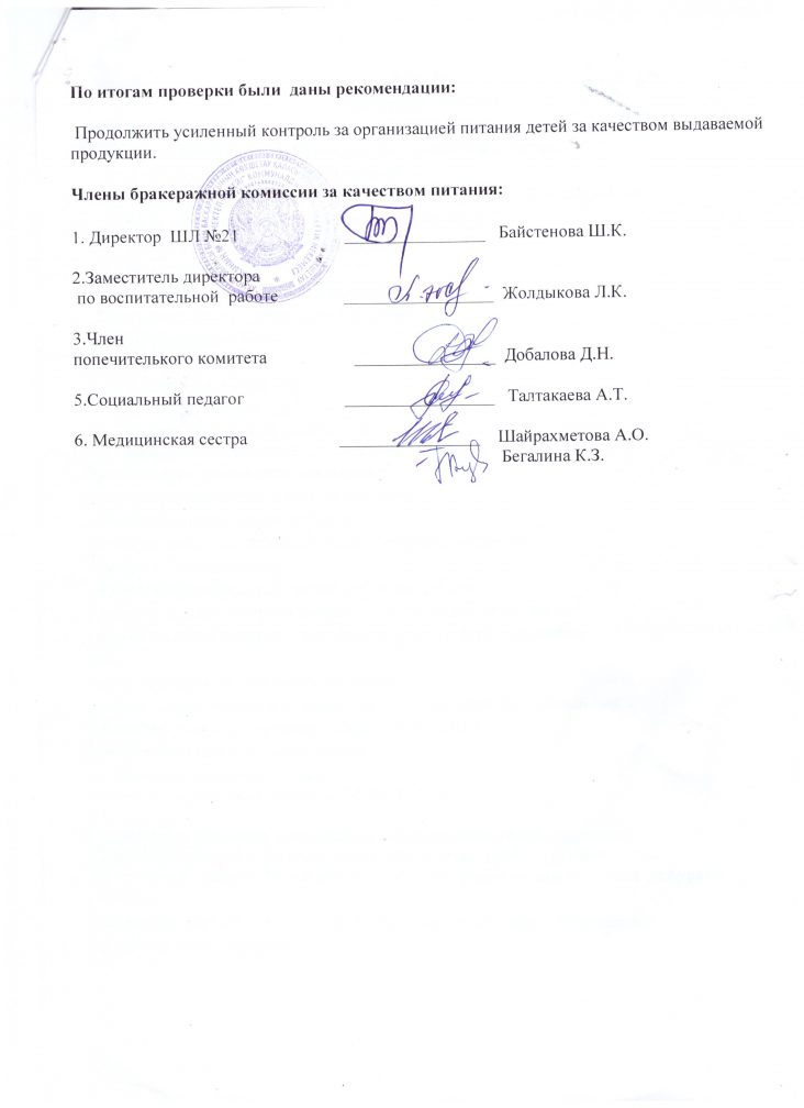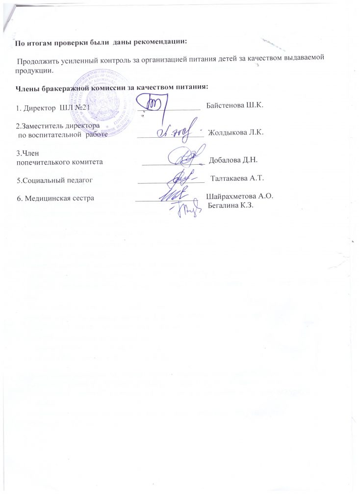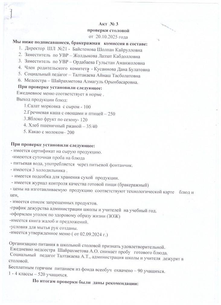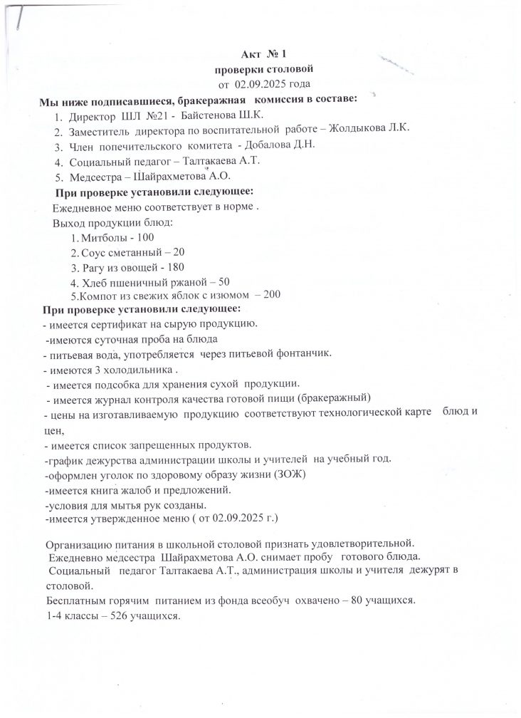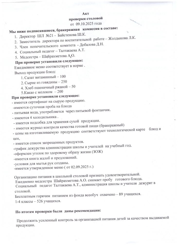 2025-2026 оқу жылы. Тамақтануды ұйымдастыруды тексеру актісі.
