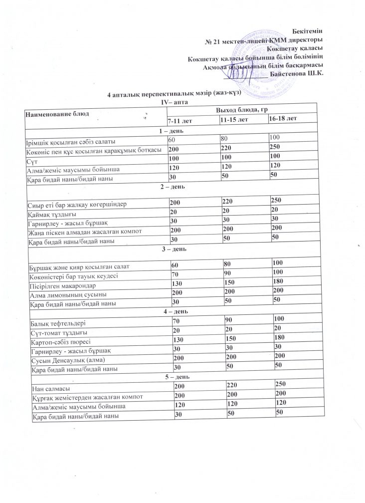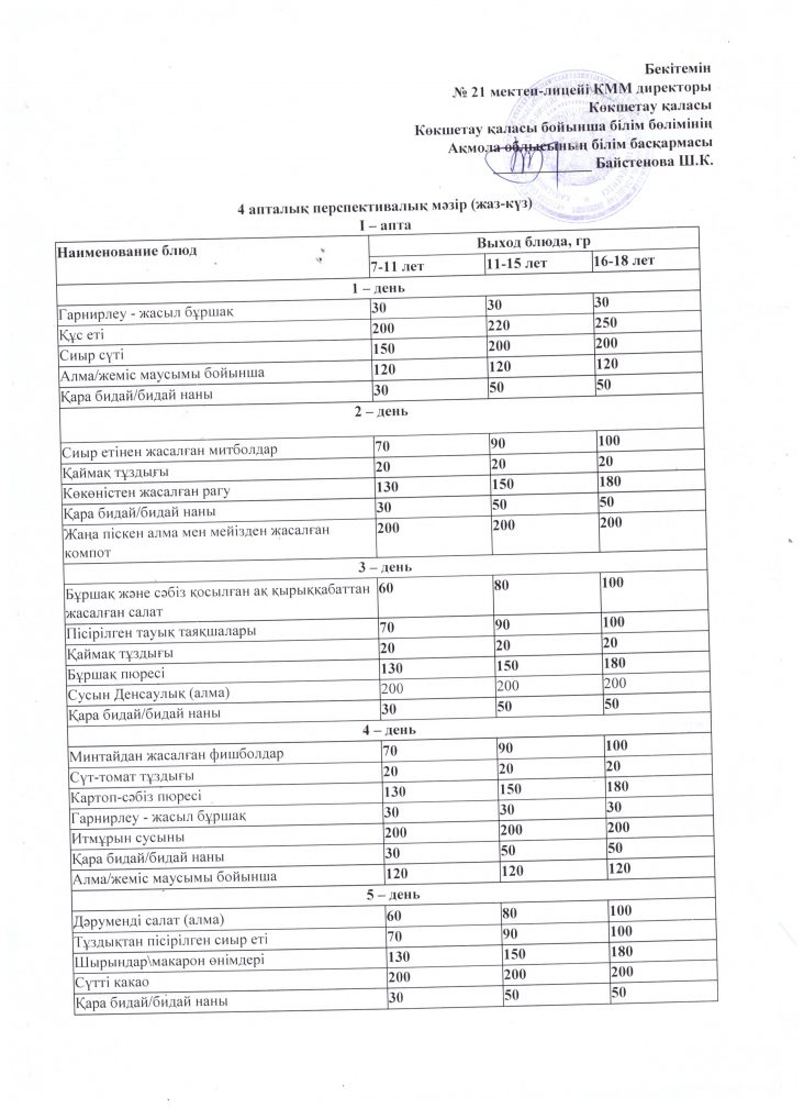 2025-2026 оқу жылы. Төрт апталық перспективалық мәзір(Жаз-Күз)