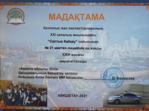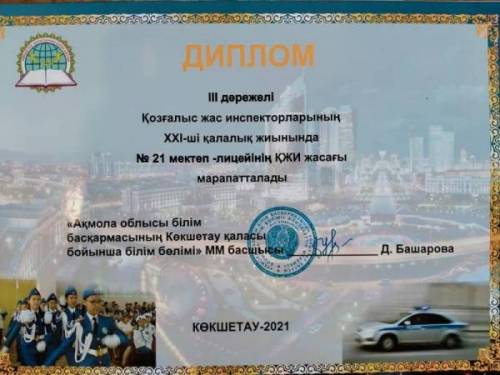 На XXI городском слете отрядов юных инспекторов движения отряд ДШИ школы-лицея №21 был награжден Дипломом III степени и ценными призами. Благодарственным письмом награждены руководитель команды Тасыгожина Баян Болатовна и член команды Аяпбергенова Аяулым. В составе команды учащиеся 5-х и 6-х классов приняли активное участие во всех конкурсах на высоком уровне. Мунгайдаров Ильяс, Сапар Айдын, Зейнулла Ислам, Болатова Алина, Душан Алмажан, Жумажан Мадияр, Аяпбергенова Аяулым, Койбагарова Томирис,Даулетбеккызы Зиба, Сатыбекова Азиза, Тореахметова Жамилия. Поздравляем!!! Молодцы!